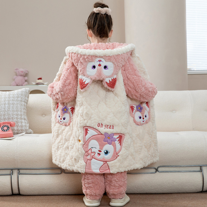 Với họa tiết hoạt hình đáng yêu và mũ trùm đầu liền thân, bộ đồ ngủ này sẽ mang đến nét vui tươi cho giờ đi ngủ.. Mũ trùm đầu giúp giữ ấm thêm cho đầu và cổ., Trong khi đó, tay áo dài và thiết kế dài đến mắt cá chân giúp che phủ toàn diện, giữ ấm cho các bé gái lớn và trẻ nhỏ từ vai đến mắt cá chân..